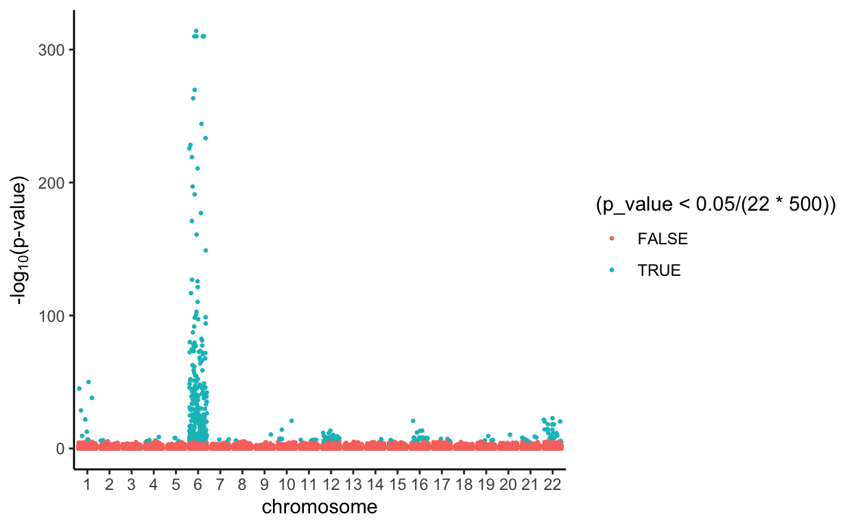 ggplot(aes(x = chr, y = minuslogp, group = interaction(chr, base_pair_location), color = (p_value<0.05/(22*500)))) +