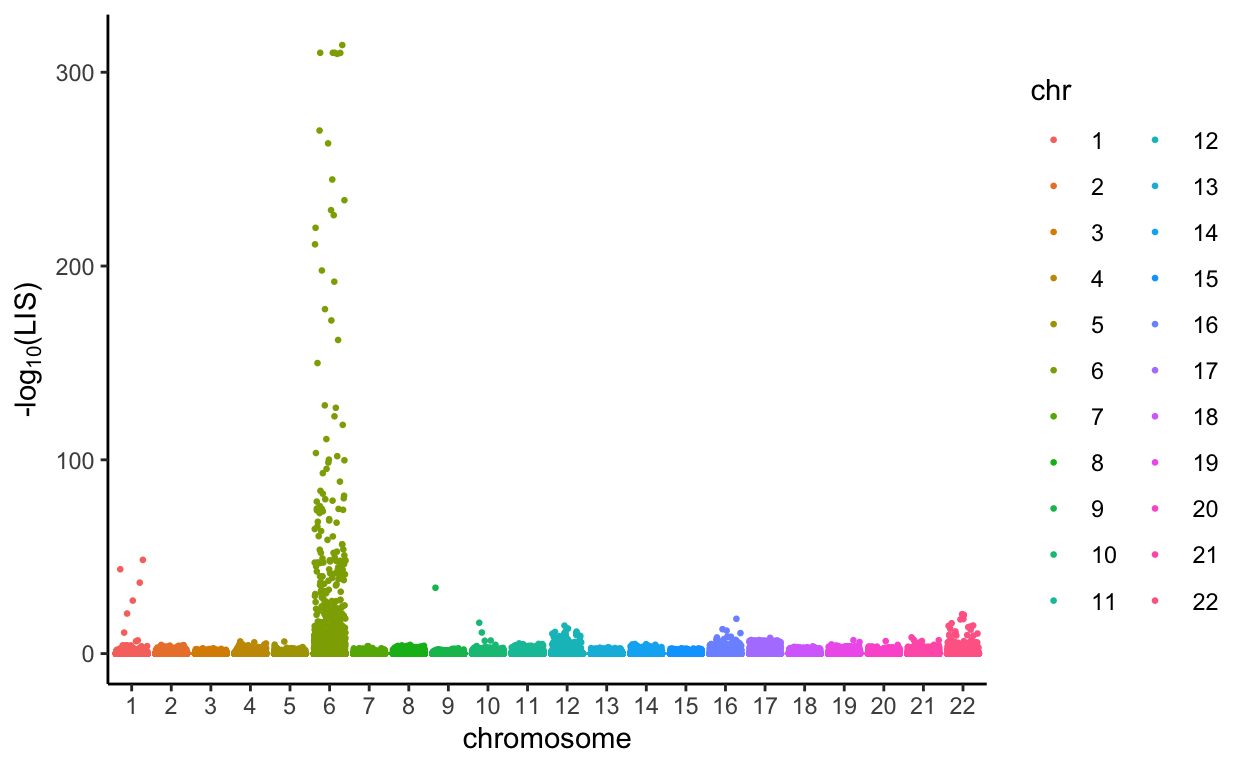 The PLIS procedure yields a new test statistic called LIS for every SNP. Since it is also very small, and smaller LIS indicates higher significance, we decided to make a Manhattan plot using it and plot -log10(LIS) for all SNPs.