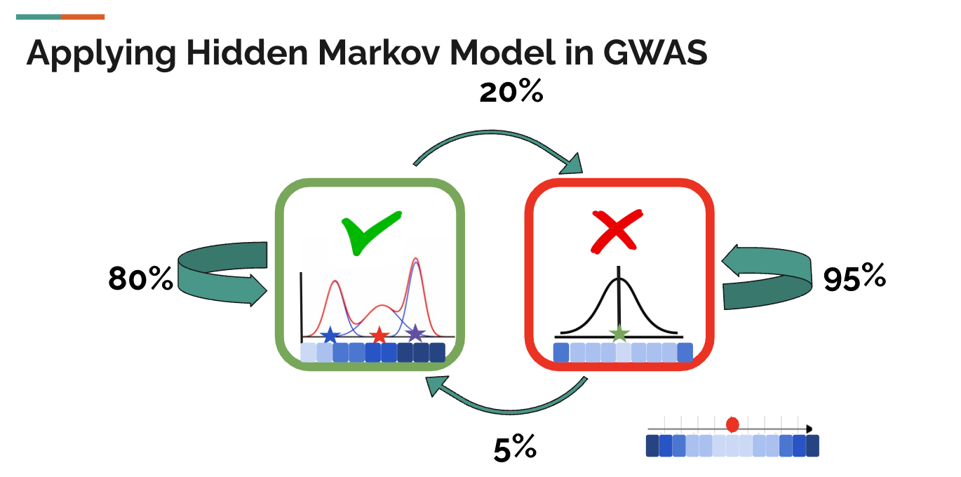 With the background knowledge of z-values, and the intuition of the correlation among nearby SNPs, we can come back to see a simple diagram of a hidden markov model in GWAS. Still, the green check mark means the SNP is associated with the trait, and the red false mark means the SNP is not associated with the SNP. In the example diagram below, if a SNP is associated with some trait, then the probability that its next SNP(by physical position) is also associated with the trait is 80%, and the probability that its next SNP is not associated with the trait is only 20%. If a SNP is not associated with the trait, then there is a 95% probability that the next SNP is also not associated with the trait and only a 5% probability that the next SNP is associated with the trait. This should match our intuition from the SNP sequence above and the how linkage disequilibrium works.