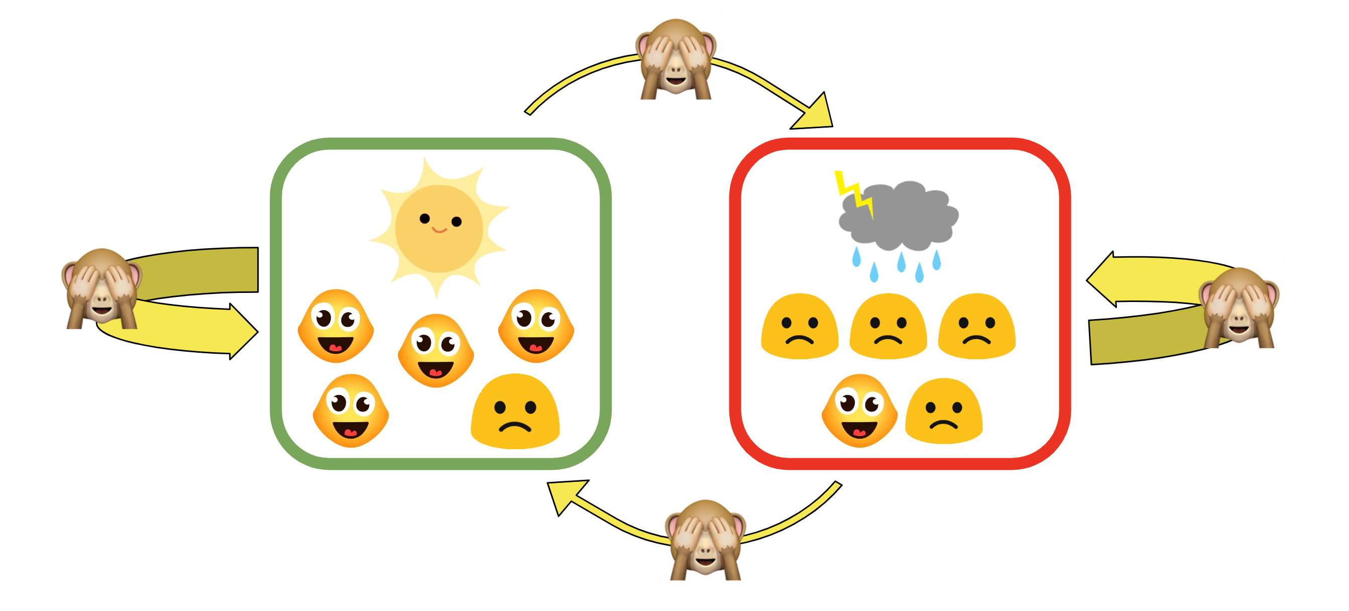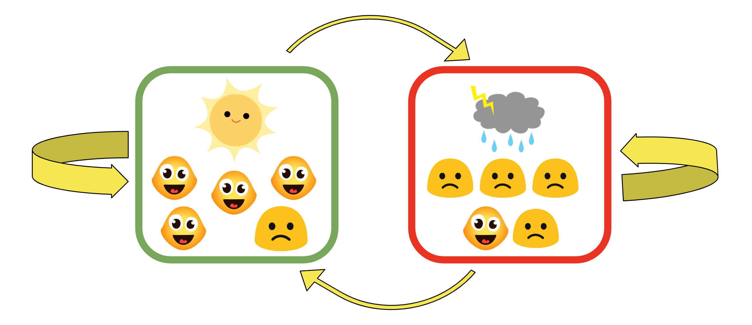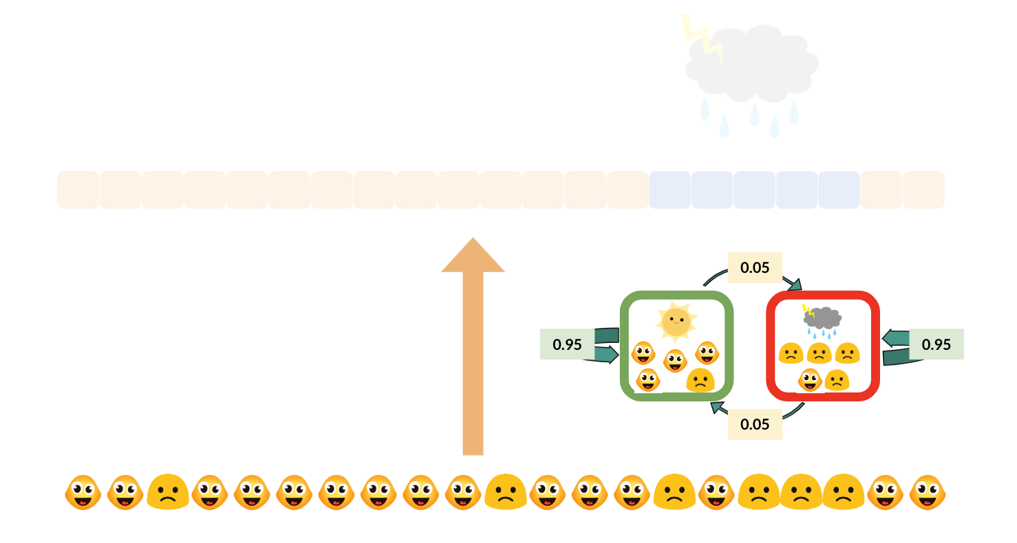 In this diagram, we also assume that sunny weather makes 80%(4/5) people happy and 20%(1/5) people sad, and rainy weather makes 80%(4/5) sad and 20%(1/5) happy. These probabilities are called the omission probabilities, which are the probabilities of observing a specific mood given the weather(the hidden state). For example, we can say the probability of observing a happy person in a city that is raining is assumed to be 20%.