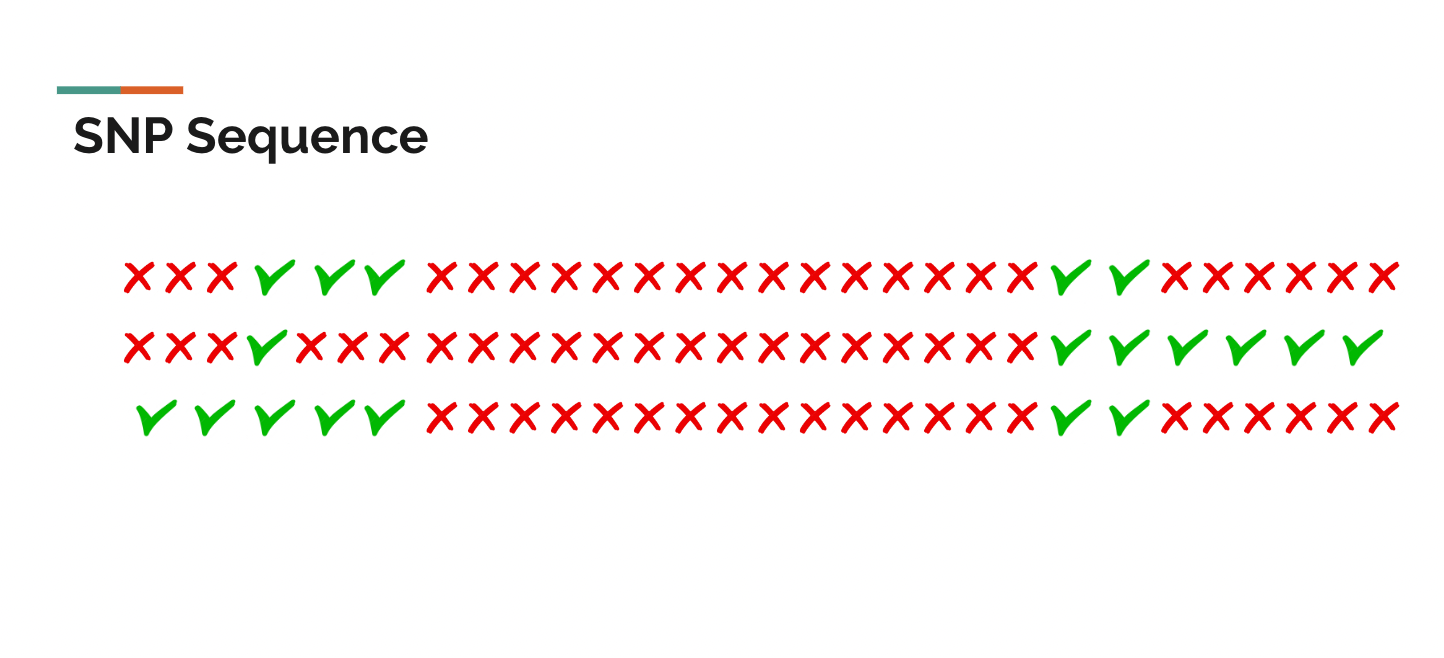 Imagine this is a section of a person’s genome, which each icon representing a single nucleotide polymorphism(SNP). For some certain trait, suppose the green check mark means this SNP is associated with the trait, and the red false mark indicates this SNP is not associated with the trait. Since SNPs are highly correlated as we learnt from the heatmap for Linkage Disequilibrium, if a SNP is associated with some trait, then its next SNP would be more likely to be also associated with the trait than not, and vice versa.