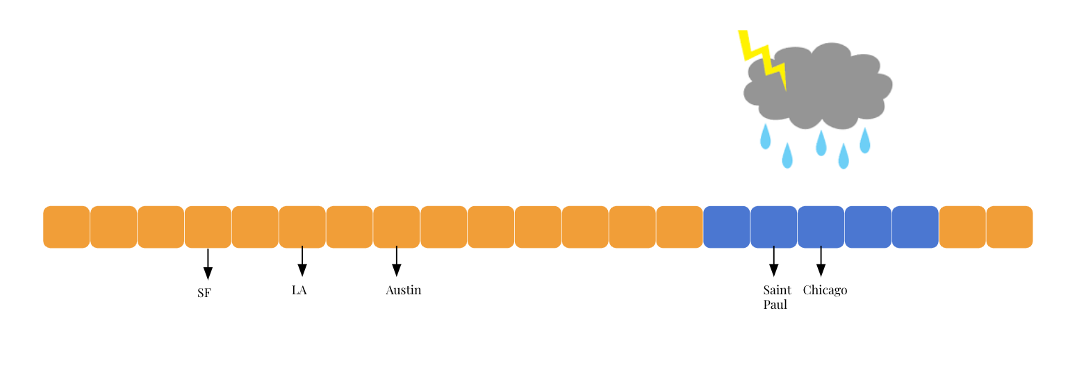 Imagine that it’s raining in some places and sunny in some other places. If we know that it’s raining in Saint Paul, it is more likely that it’s also raining rather than sunny in cities nearby Saint Paul. If we know that it’s sunny in LA, then we could to some extent safely assume that it’s more likely for cities close to it, e.g. San Francisco, to be sunny rather than rainy.